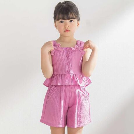 女の子がときめくフリルとリボンのデザインがあしらわれた夏らしいセットアップ。