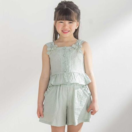 女の子がときめくフリルとリボンのデザインがあしらわれた夏らしいセットアップ。