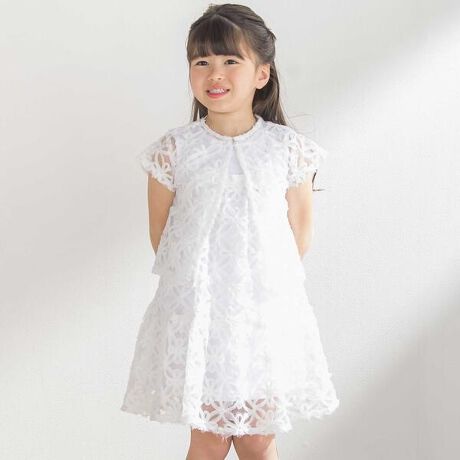 全面にあしらわれた立体花レースが華やかなワンピース×ボレロと無地のワンピースがセットになった女の子用アイテム。