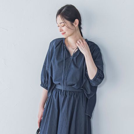 軽やかでナチュラルな風合いが魅力のライトデニムギャザーブラウス。