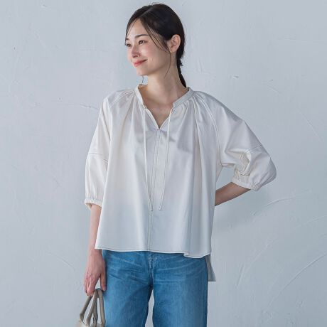 軽やかでナチュラルな風合いが魅力のライトデニムギャザーブラウス。