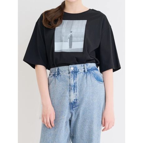 モノトーンの転写プリントをあしらった大人カジュアルなTシャツ