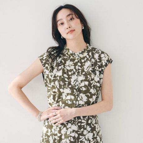 単色使いの花柄のブラウスは、この時期にピッタリなフレンチスリーブのアイテムです。