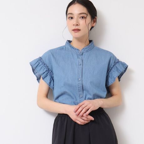 袖と襟もとにフリルをデザインしたデニムブラウス。