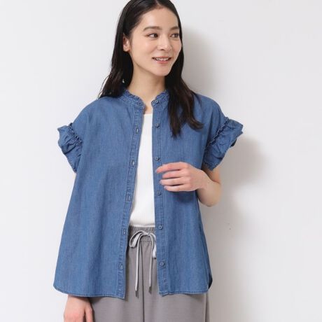 袖と襟もとにフリルをデザインしたデニムブラウス。
