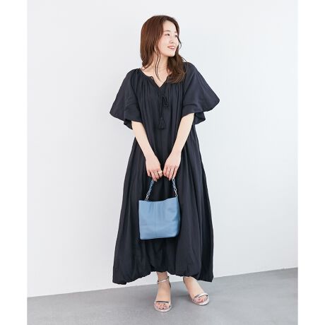 裾と袖がトレンド感のあるバルーン使用のワンピースで、ロング丈ながら軽い印象を与えてくれます。