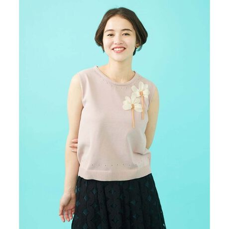 上品なニットプルオーバー。一枚着にもぴったりな、ほどよくゆとりを持たせたシルエットです。胸元には大ぶりなお花のモチーフをあしらい、お顔周りに華やかな印象をプラス。暑い日も快適に着用できるノースリーブタイプです。襟ぐりと裾には小さなドット柄のアイレット編みがアクセントに。