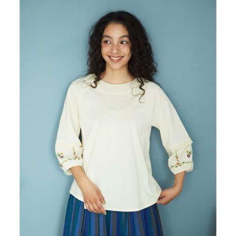 袖口の刺繍がポイントのカットソー。袖に丸みがあり、襟ぐりにヨークを入れたブラウスライクなデザインです。ゆったりした身頃とラグランスリーブのリラクシーなシルエット。袖丈はロングシーズン着用いただける半端袖タイプで、袖口の花刺繍がアクセントに。異素材を使用し切り替えを入れた袖と首元のデザインにも注目です。首元の開きが少なくオーバーサイズ見えせず小柄な方にもオススメです。