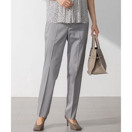 1本あると大活躍のスタイリッシュなテーパードパンツ。どんなトップスにも合わせやすく、オフィスでもデイリーにも万能に活躍できるアイテムです。ウエストの後ろにはゴムで伸縮性を持たせ、ストレスのない穿き心地に。同シリーズのジャケットときれいめセットアップで着たり、単品使いでブラウスと合わせても着られる、着回し力抜群のパンツです。カラーは、あか抜けた印象のライトグレー(#003)、きちんと感が増すネイビー(#075)の2色展開です。