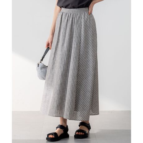 天然素材の風合いと、ストライプ柄が印象的なスカート。フロントとサイドそれぞれの柄の見え方を変えることで立体感ある印象の1枚です。ウエストの後ろ部分がゴム仕様のため、ストレスフリーな着心地も魅力。シンプルなトップスと合わせて爽やかに着ていただけるデザインです。カラーは、清涼感のあるホワイトストライプ(#101)と、落ち着いた印象のダークブラウンストライプ(#135)2色展開です。