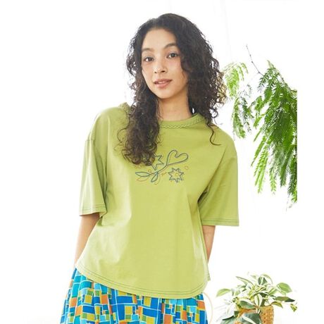 デイリー使いにぴったりなTシャツ。体のラインを拾い過ぎず、少しゆとりのあるサイズ感で一枚着にもぴったりなシルエットです。裾はやや短めで、ラウンドカットのすっきりとした印象にお仕立てしました。襟ぐりに丸いレースをあしらい、胸元にはチェーン刺繍でお花とハートの柄を施したデザインに。モチーフはグリーンベースには二配色でホコモモラらしい色合いに、アイボリーベースにはブラックでモノトーンのすっきりした印象に仕上げました。さりげなく入ったJOCOの文字刺繍にも注目です。