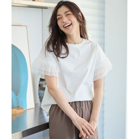 ふんわり軽やかなチュールが大人可愛い、異素材コンビプルオーバー