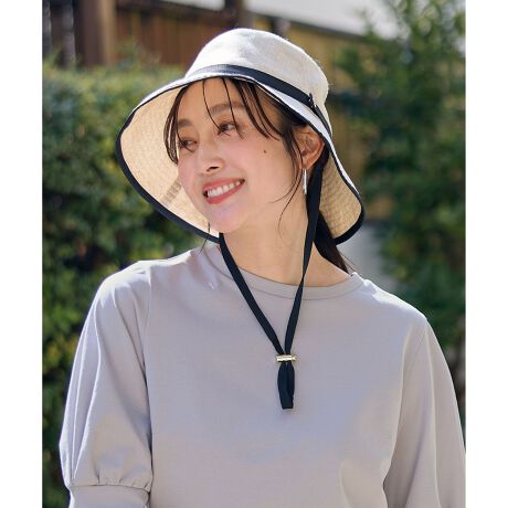 デザイン・雑材シートの素材感が夏らしいハット・あご紐は取り外し可能・カジュアルにもキレイめにも合わせやすい・UVケアの機能付きで日焼け対策にもおすすめ・内側の一周ぐるりと巻いたテープの裏側にマジックテープが付いておりサイズ調整が可能・ギフトにもおすすめ