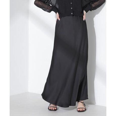 裾に向かって入ったフレア感が上品なサテンマキシスカート。品のあるしなやかさがありつつ、ウエストゴムのイージー仕様も嬉しい!程よい光沢感が女性らしくオケージョンやセレモニーシーンにも活躍する一枚です。