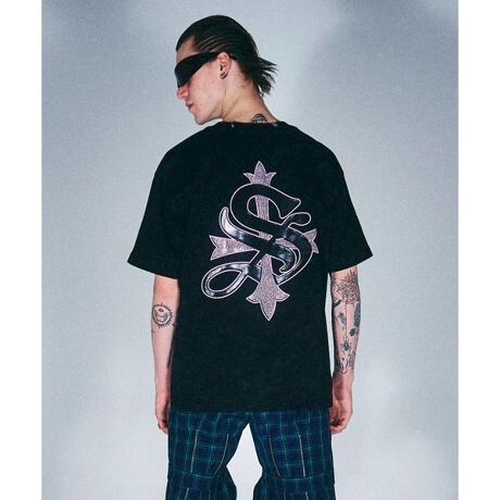 フロントにはブランドロゴをさりげなく配置し、バックには圧倒的な存在感を放つストーンとプリントで表現したグラフィックを大胆にオン。