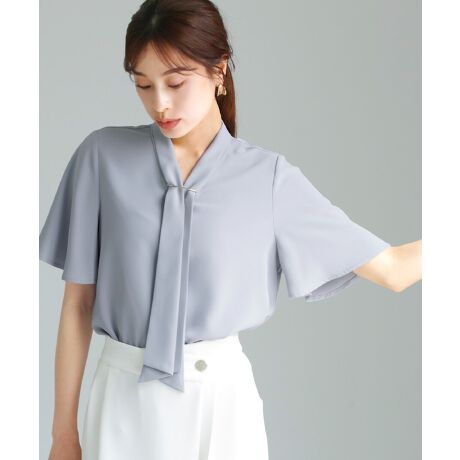 洗濯機OK・接触冷感【 一枚で着映える 】とろみデシン・ボウタイデザインフレア半袖ブラウス
