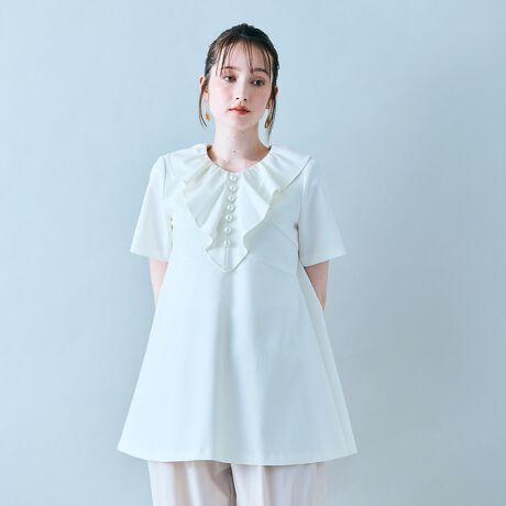 ・胸元に波打つようなフリルを大胆にあしらい、1枚で着映えする主役アイテム。