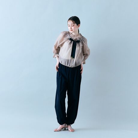 スタンダードなアイテムに女性らしい柔らかさを加え、モードに仕上げたオーディアミューズ。