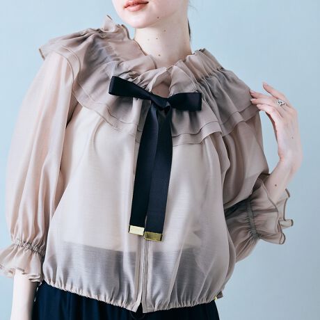 ・首元の大きなリボンが目を引くシアーブルゾン。