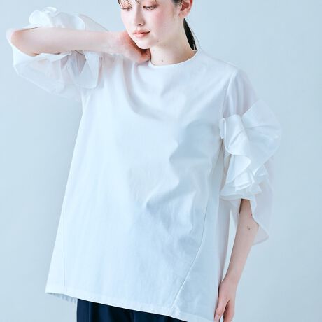 ・身頃はカットソー素材、袖はタイプライター素材を使用した異素材MIXのデザイン。