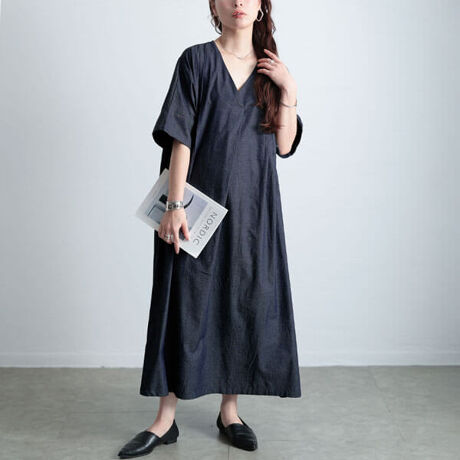 爽やかな印象引き立つコットンシャンブレータックワンピースの登場です☆体型を拾わないゆったりシルエットでお腹〜脚まで気になる部分をまるごとカバー◎胸元&肩タックでお胸が大きめの方でも窮屈感なくゆったりとご着用いただけます。肩タックを入れることで視覚効果が生まれ肩幅を華奢見せてくれるのも嬉しいポイント♪綿100%シャンブレー生地でさらりと爽やかな着心地◎