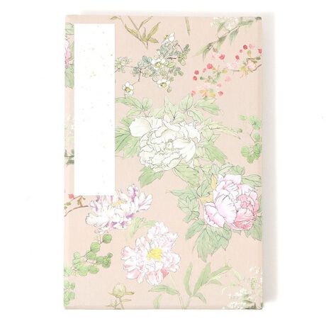 榛原に図案を提供していた伊藤綾春の画帳から季節の花かいどう(海棠)ぼたん(牡丹)うのはな(卯の花)赤しゃくやく(赤芍薬)白しゃくやく(白芍薬)のばら(野薔薇)さんきらい(山帰来)で構成した「路花草」柄です。