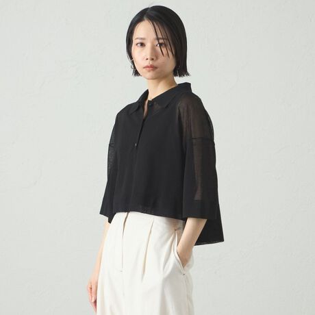 シアーな編地で作ったポロシャツデザインニット。