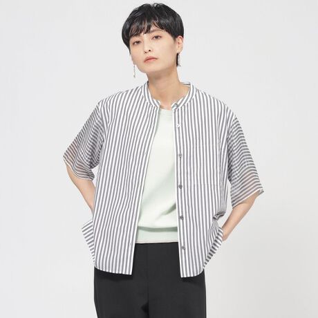 【ウォッシャブル】シアーコンビストライプバンドカラーシャツ