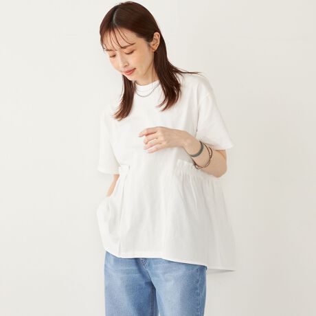 カットソー素材に布帛生地をドッキングして、華やかな印象に仕上げた着映えトップス。