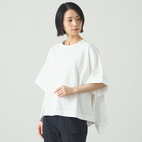 ポンチョのようなシルエットのオーバーサイズカットソー。太幅のステッチデザインを入れて、全体の雰囲気を引き締めました。