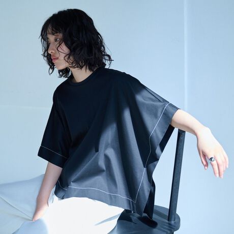 ポンチョのようなシルエットのオーバーサイズカットソー。太幅のステッチデザインを入れて、全体の雰囲気を引き締めました。
