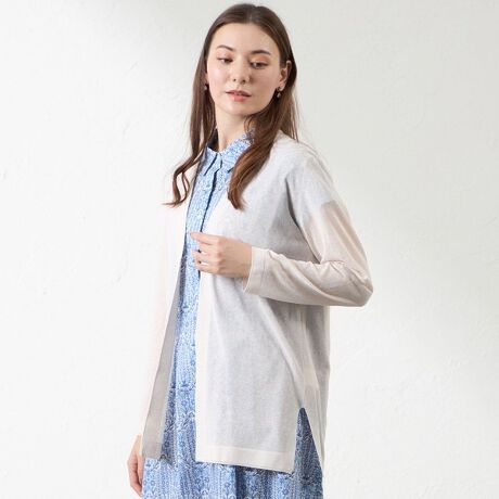 [型番:V5N20548__]ナチュラルミックスカーディガン【デザイン】着回しのきくシンプルなデザインの着流しカーディガンです。脇はゴム地で切り替えてあり、前立は見返し仕様ですっきりとした印象に仕上げました。脇はスリットあきになっています。【素材】綿のしなやかな風合い、麻のナチュラルな清涼感にポリエステル糸を複合した素材です。シャープなタッチと光沢感を兼ね備えた涼し気な素材感です。手洗い可能でお手入れもしやすくなっています。