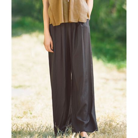 ドレープ感が女性らしい、快適な着心地のワイドパンツ■デザイン昨年大好評を頂いたウエスト総ゴムのワイドパンツです。イージーな着用感のゴムパンツでありながら、ウエスト位置が高く見えるようにデザインしています。しなやかで落ち感のある薄地の素材ですが、たっぷりと取ったタックとギャザーを入れることでしっかりとゆとりを生み、体のラインを拾いにくく、すっきりと見えるバランスに仕上げました。昨年の着心地の良さはそのままに、より腰周りがすっきりと見えるようにブラッシュアップしています。同素材のブラウス(BLWMGM0507)と合わせてオールインワン風のコーディネートもおすすめです。■素材柔らかく綺麗なレーヨンと程よい光沢感のあるナイロンを、とろみとドレープ感に若干のハリ感を出してバランスよく仕上げたツイル素材です。非常に軽く、揺れるような動きのある綺麗な素材ですが、やや表情のあるラフな表面感に仕上げた大人カジュアルな素材です。接触冷感、UVケアの機能付きです。■同素材アイテムキュロットパンツ(PRW7GM0508)ノースリーブブラウス(BLW7GM0507)