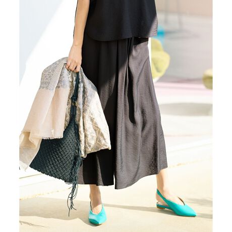 累計2500本突破!昨年大好評のキュロットパンツに新色が登場!スカート見えするゆったりシルエットのギャザーパンツ■デザインスカート見えするキュロットパンツです。しなやかで落ち感のある薄地の素材に、たっぷりとタックとギャザーを入れたゆったりとしたシルエットがリラックス感のあるデザインです。薄地でありながら透けにくい素材なのであえて裏地は付けず、涼しげでさらりとした着用感で盛夏にも活躍するアイテムです。ウエストは総ゴムなので、着心地の良さもポイントです。同素材のブラウスと合わせてオールインワン風のコーディネートもおすすめです。■素材柔らかく綺麗なレーヨンと程よい光沢感のあるナイロンを、とろみとドレープ感に若干のハリ感を出してバランスよく仕上げたツイル素材です。非常に軽く、揺れるような動きのある綺麗な素材ですが、やや表情のあるラフな表面感に仕上げた大人カジュアルな素材です。接触冷感、UVケアの機能付きです。■同素材アイテムプルオーバーブラウス(BLWMLM0517)ノースリーブブラウス(BLWMGM0507)ワイドパンツ(PRWMGM0507)