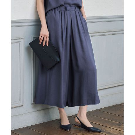 スカート見えするゆったりシルエットのギャザーパンツ■デザインスカート見えするキュロットパンツです。しなやかで落ち感のある薄地の素材に、たっぷりとタックとギャザーを入れたゆったりとしたシルエットがリラックス感のあるデザインです。薄地でありながら透けにくい素材なのであえて裏地は付けず、涼しげでさらりとした着用感で盛夏にも活躍するアイテムです。ウエストは総ゴムなので、着心地の良さもポイントです。同素材のブラウス(BLWRGM0507)と合わせてオールインワン風のコーディネートもおすすめです。■素材柔らかく綺麗なレーヨンと程よい光沢感のあるナイロンを、とろみとドレープ感に若干のハリ感を出してバランスよく仕上げたツイル素材です。非常に軽く、揺れるような動きのある綺麗な素材ですが、やや表情のあるラフな表面感に仕上げた大人カジュアルな素材です。接触冷感、UVケアの機能付きです。■同素材アイテムワイドパンツ(PRWRGM0507)ノースリーブブラウス(BLWRGM0507)