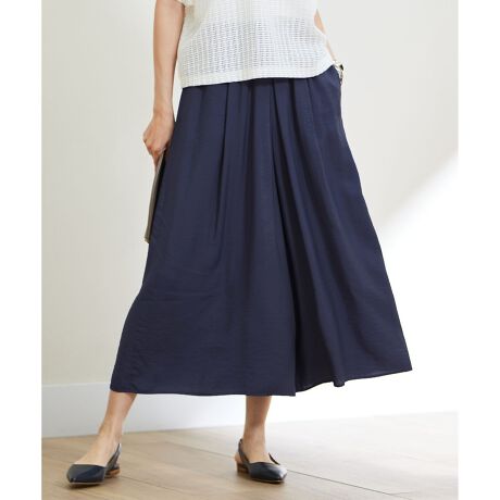 スカート見えするゆったりシルエットのギャザーパンツ■デザインスカート見えするキュロットパンツです。しなやかで落ち感のある薄地の素材に、たっぷりとタックとギャザーを入れたゆったりとしたシルエットがリラックス感のあるデザインです。薄地でありながら透けにくい素材なのであえて裏地は付けず、涼しげでさらりとした着用感で盛夏にも活躍するアイテムです。ウエストは総ゴムなので、着心地の良さもポイントです。同素材のブラウス(BLWRGM0507)と合わせてオールインワン風のコーディネートもおすすめです。■素材柔らかく綺麗なレーヨンと程よい光沢感のあるナイロンを、とろみとドレープ感に若干のハリ感を出してバランスよく仕上げたツイル素材です。非常に軽く、揺れるような動きのある綺麗な素材ですが、やや表情のあるラフな表面感に仕上げた大人カジュアルな素材です。接触冷感、UVケアの機能付きです。■同素材アイテムワイドパンツ(PRWRGM0507)ノースリーブブラウス(BLWRGM0507)