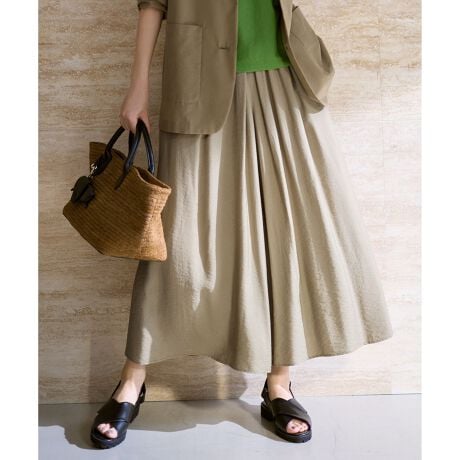 累計2500本突破!昨年大好評のキュロットパンツに新色が登場!スカート見えするゆったりシルエットのギャザーパンツ■デザインスカート見えするキュロットパンツです。しなやかで落ち感のある薄地の素材に、たっぷりとタックとギャザーを入れたゆったりとしたシルエットがリラックス感のあるデザインです。薄地でありながら透けにくい素材なのであえて裏地は付けず、涼しげでさらりとした着用感で盛夏にも活躍するアイテムです。ウエストは総ゴムなので、着心地の良さもポイントです。同素材のブラウスと合わせてオールインワン風のコーディネートもおすすめです。■素材柔らかく綺麗なレーヨンと程よい光沢感のあるナイロンを、とろみとドレープ感に若干のハリ感を出してバランスよく仕上げたツイル素材です。非常に軽く、揺れるような動きのある綺麗な素材ですが、やや表情のあるラフな表面感に仕上げた大人カジュアルな素材です。接触冷感、UVケアの機能付きです。■同素材アイテムプルオーバーブラウス(BLW7LM0517)ノースリーブブラウス(BLW7GM0507)ワイドパンツ(PRW7GM0507)