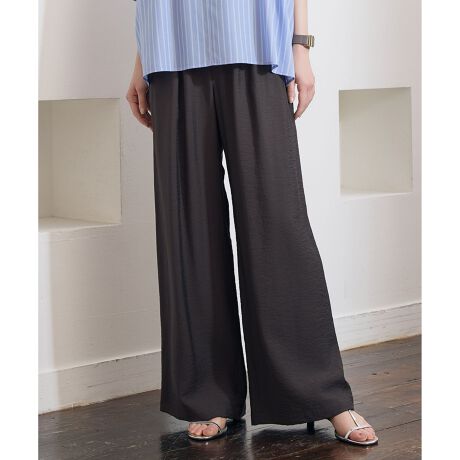 人気のため新色追加!ドレープ感が女性らしい、快適な着心地のワイドパンツ■デザイン昨年大好評を頂いたウエスト総ゴムのワイドパンツです。イージーな着用感のゴムパンツでありながら、ウエスト位置が高く見えるようにデザインしています。しなやかで落ち感のある薄地の素材ですが、たっぷりと取ったタックとギャザーを入れることでしっかりとゆとりを生み、体のラインを拾いにくく、すっきりと見えるバランスに仕上げました。昨年の着心地の良さはそのままに、より腰周りがすっきりと見えるようにブラッシュアップしています。同素材のと合わせてオールインワン風のコーディネートもおすすめです。■素材柔らかく綺麗なレーヨンと程よい光沢感のあるナイロンを、とろみとドレープ感に若干のハリ感を出してバランスよく仕上げたツイル素材です。非常に軽く、揺れるような動きのある綺麗な素材ですが、やや表情のあるラフな表面感に仕上げた大人カジュアルな素材です。接触冷感、UVケアの機能付きです。■同素材アイテムプルオーバーブラウス(BLWRLM0517)ノースリーブブラウス(BLWRGM0507)キュロットパンツ(PRWRGM0508)