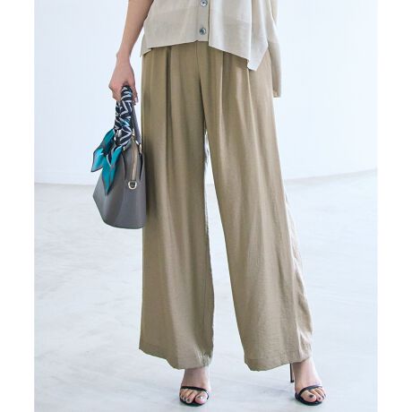 人気のため新色追加!ドレープ感が女性らしい、快適な着心地のワイドパンツ■デザイン昨年大好評を頂いたウエスト総ゴムのワイドパンツです。イージーな着用感のゴムパンツでありながら、ウエスト位置が高く見えるようにデザインしています。しなやかで落ち感のある薄地の素材ですが、たっぷりと取ったタックとギャザーを入れることでしっかりとゆとりを生み、体のラインを拾いにくく、すっきりと見えるバランスに仕上げました。昨年の着心地の良さはそのままに、より腰周りがすっきりと見えるようにブラッシュアップしています。同素材のと合わせてオールインワン風のコーディネートもおすすめです。■素材柔らかく綺麗なレーヨンと程よい光沢感のあるナイロンを、とろみとドレープ感に若干のハリ感を出してバランスよく仕上げたツイル素材です。非常に軽く、揺れるような動きのある綺麗な素材ですが、やや表情のあるラフな表面感に仕上げた大人カジュアルな素材です。接触冷感、UVケアの機能付きです。■同素材アイテムプルオーバーブラウス(BLWRLM0517)ノースリーブブラウス(BLWRGM0507)キュロットパンツ(PRWRGM0508)