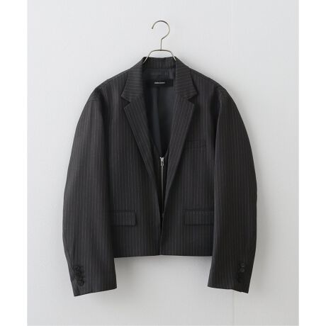 ベストをレイヤードしているようなディテールがキャッチーなジャケット。ストライプ生地を使用し、フロントのファスナー使い、後ろ身頃はMA-1の様に肩ダーツが入っていたり、裾がリブになっているなど拘ったデザイン。
