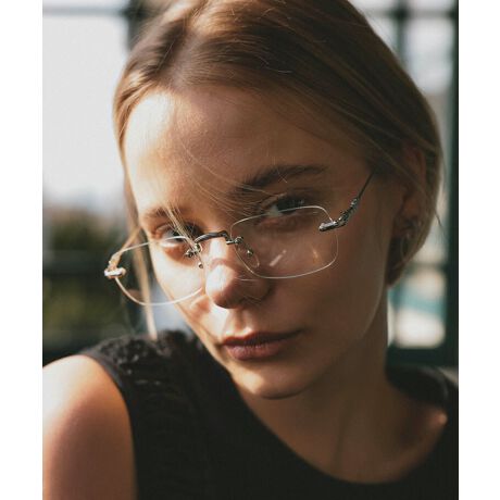 トレンド感のあるリムレスフレームが特徴のメガネ。