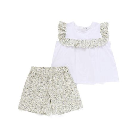 夏の草原のようなすっきりとした花柄がかわいいTシャツとパンツのセットアップ。