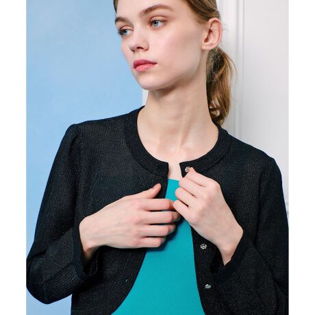 ラメ糸とビジュー釦が華やかなニットボレロ。