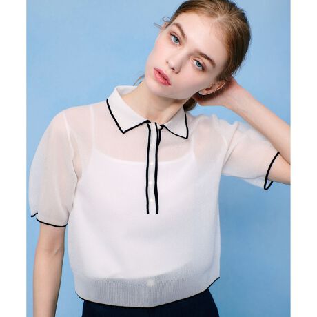 光沢感あるポロ衿プルオーバーに華奢なラインをピリリと効かせてほんのりスポーツテーストに仕上げました。