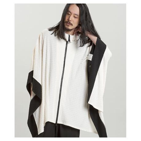 立体的な凹凸のある生地感とドレープを自在に調整できるドローストリング仕様が特徴のハイカラーポンチョ。ゆったりとしたシルエットにWジップファスナーを採用し、モードな雰囲気を演出するデザインに仕上げました。