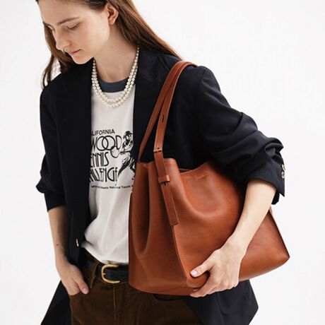 精緻な手仕上げの天地調整用の真鍮Hカンや、外縫いのストレートなカッティングの切り目が 、味のあるオイルアップレザーを引き立てつつ、垢ぬけた見た目の“軽快”さの演出も実現。