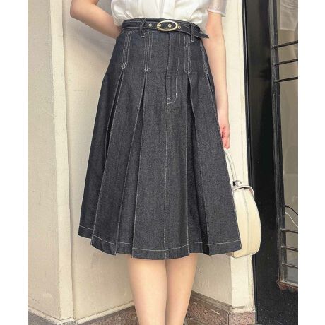 【洗える】ベルト 付き ボックス タック デニム スカート