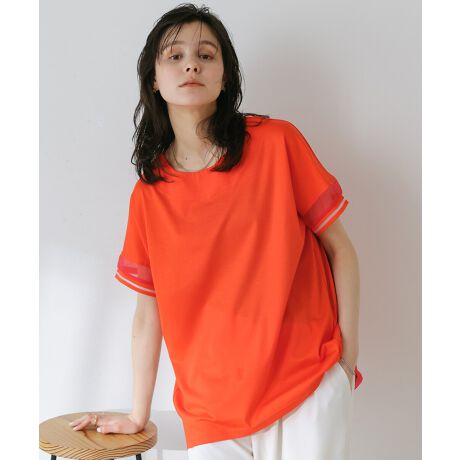 袖のシアー配色がワンポイントになっており、カジュアルになりがちなTシャツの増える夏に嬉しいブラウス見えカットソーです。ほど良い長さの袖丈で二の腕カバーも叶います。カーデを羽織らず1枚で着たいトップスです。