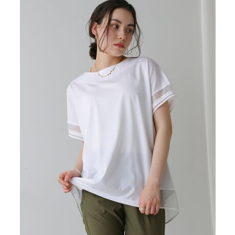 袖のシアー配色がワンポイントになっており、カジュアルになりがちなTシャツの増える夏に嬉しいブラウス見えカットソーです。ほど良い長さの袖丈で二の腕カバーも叶います。カーデを羽織らず1枚で着たいトップスです。