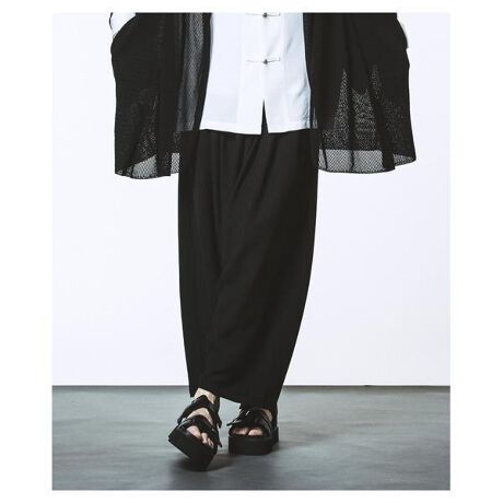ナチュラルなシワ感を持つシュリンク加工の生地を採用し、独特の表情と清涼感のある履き心地を実現したサルエルトラウザーズ。股上を深く、股下を短めに設定することで、シルエットに立体感を加え、リラックス感とモードな雰囲気を両立させたデザイン。